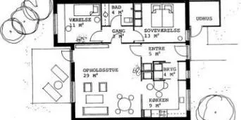 Stor, lys stue på 29 m2, værelse på 11 m2, soveværelse med skabe, badeværelse med lyse fliser og brus, spisekøkken, bryggers og entre.