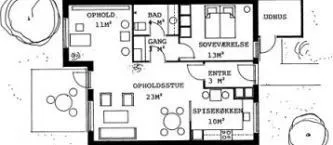 Stor, lys stue på 23 m2 + 11 m2, der eventuelt kan inddrages til værelse, soveværelse med skabe, badeværelse med lyse fliser og brus, spisekøkken og entre.